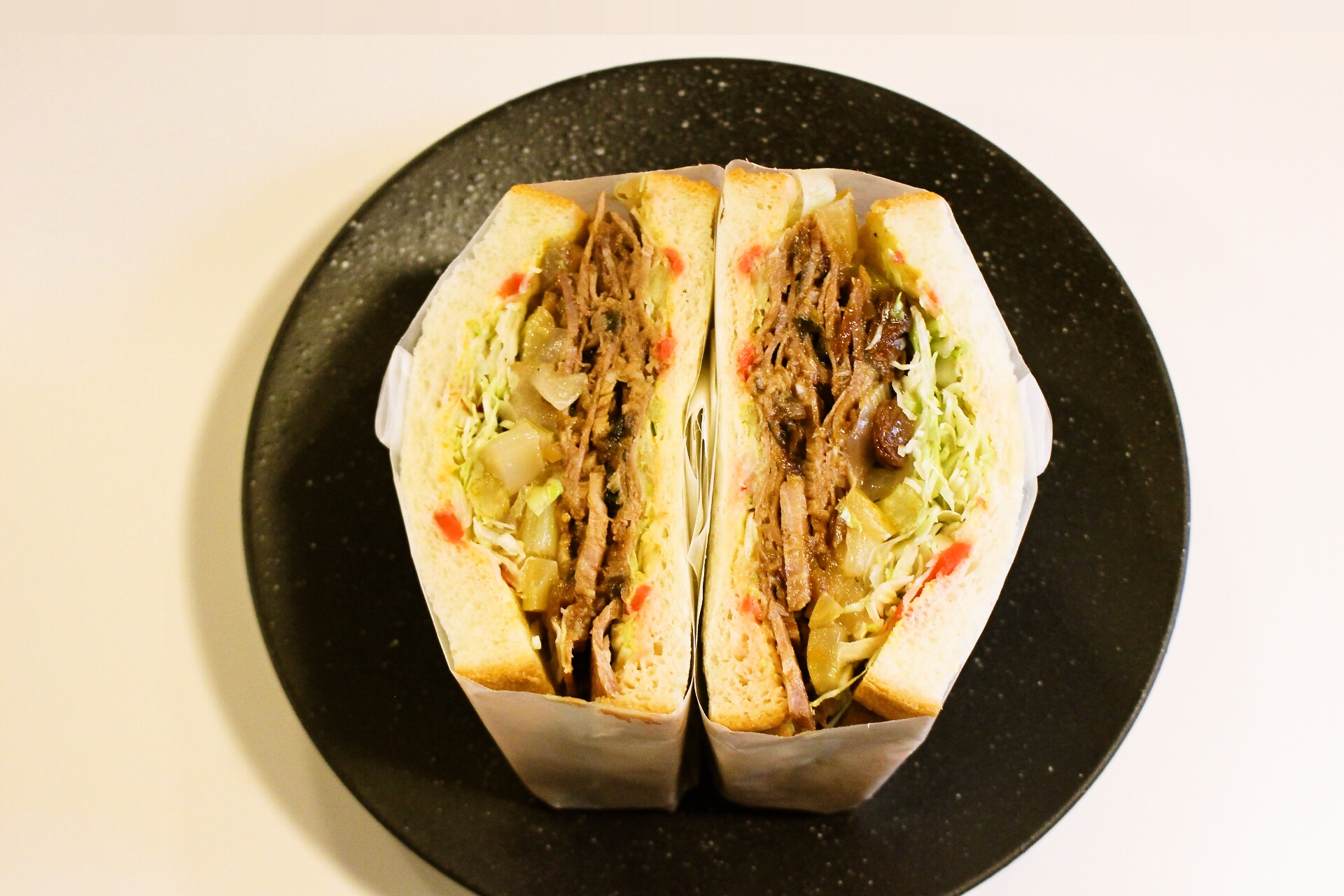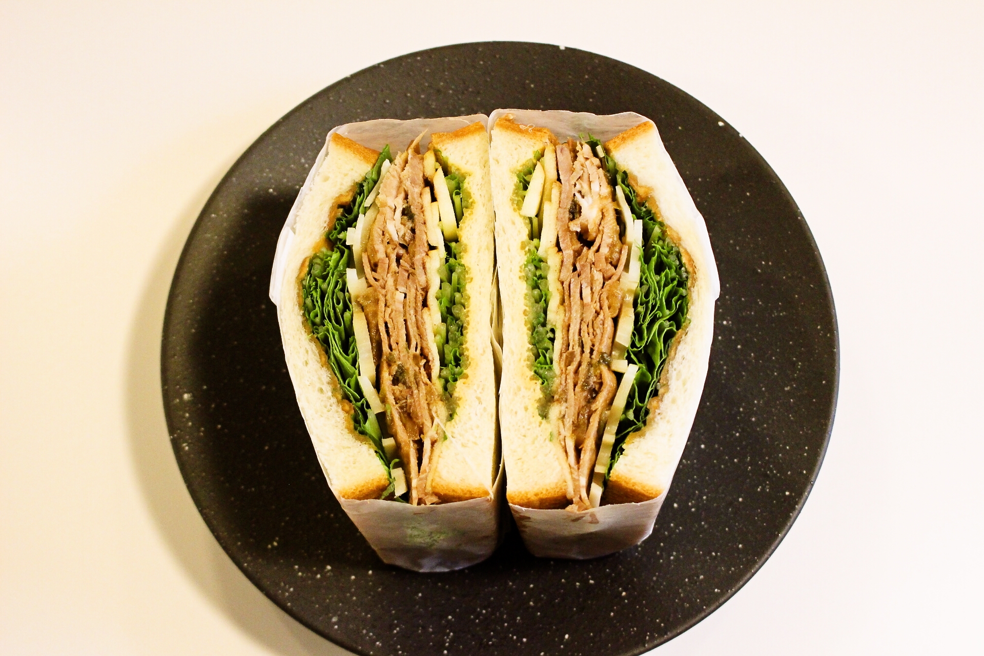 甘辛焼豚 秋テイスト -リンゴと季節のシャキシャキ野菜 アジアン風味でサンドイッチ Sweet spicy roasted pork and Appleand Seasonal vegetables Asian flavor sandwiches |